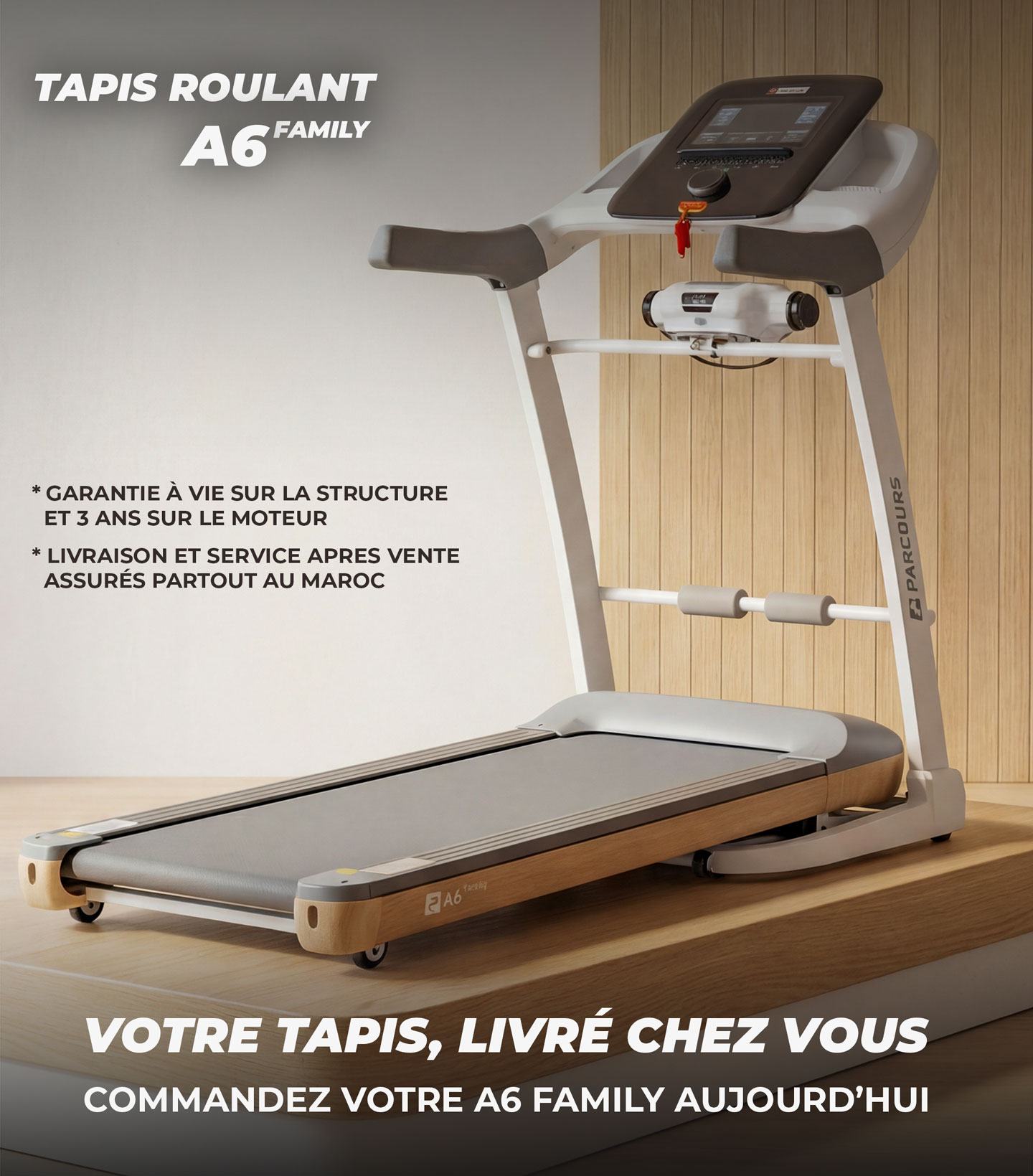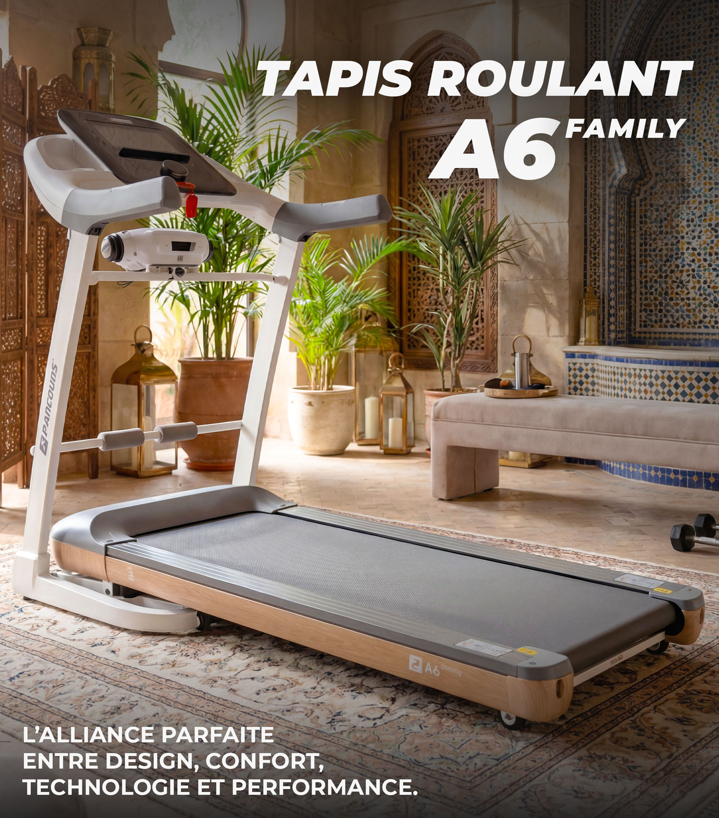 Tapis De Course A6 Family Le Tapis Connecté pour un entraînement personnalisé L'A6 Family est conçu pour exceller dans le confort et la puissance, s'adaptant aux besoins de chaque coureur, du marcheur au marathonien. Son moteur puissant et son système d'amorti réglable garantissent un entraînement sécurisé et stimulant pour tous les membres de votre foyer.